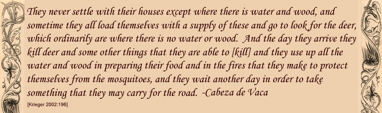 Prickly Pear Grounds There has been considerable debate about the location of the prickly-pear tuna grounds first visited by Cabeza de Vaca and his fellow trekkers. As noted, Alex Krieger places the major tuna ground visited by Cabeza de Vaca and his traveling companions during the initial phase of their South Texas sojourn some 30-40 miles south of San Antonio, in southern Atascosa and northern McMullen counties. Thomas N. Campbell, who was also very knowledgeable about Cabeza de Vaca’s route, located this particular tuna ground about 100 miles south of San Antonio, in central Jim Wells County and vicinity. This location is also favored by many of today’s students of Cabeza de Vaca. Interestingly, Campbell’s location of choice corresponds with Krieger’s alternate location near Alice, Texas. Both Krieger and Campbell located the second major tuna ground—where the trekkers overwintered with the Avavares—a few miles south of the Nueces River in northern Webb and Duval counties. Regardless of where one places these tuna grounds, it is evident to anyone familiar with greater South Texas that prickly pear grows in abundance throughout much of the region. Cabeza de Vaca reported that the best of times for the region’s native people were when the sweet tunas ripened, as there was plenty for all and various bands gathered for the harvest and held trade fairs as well. He added that “there are many kinds of tunas and among them some are very good, although to me they all seemed so and hunger never gave me time to choose, nor to reflect on which were better.” Henri Joutel, an officer of the ill-fated French colony on near Matagorda Bay in the late 1600s was not as impressed as Cabeza de Vaca about the goodness of tuna; he noted only that “these fruits do not have much taste; they are in several shapes, sizes and colors.” Botanists today also distinguish several species and varieties of prickly pear that grow in the region. As discussed in later, different parts of the prickly pear plant were eaten at different times of the year. In the springtime, the young pads or nopalitos (i.e., stems) were at their best. A ubiquitous presence of prickly pear pollen in human coprolites (dehydrated feces) recovered from rock shelters in the lower Pecos area indicates that the flowers, or more likely the flower buds, were relished as well. Green tunas, while perhaps not a favorite per se, were eaten regularly during the summer when food was otherwise quite scarce. It was, however, the sweet, ripe, purple-colored tunas that were clearly the favored foodstuff during the fall. In many cases, potable water was scarce at the tuna grounds, such that the trekkers and presumably their hunter-gatherer hosts quenched their thirst with the juice of the sweet fruit. The trekkers reported that they collected and drank juice from prickly-pear tuna in a “trench that we made in the earth” and that they did this “for lack of other vessels.” His comments about a “lack of other vessels” might well be taken as an indication that these particular Coahuiltecans did not make much use of pottery. Elsewhere in the text, however, he provides ample evidence for the presence of ceramic vessels among Coahuiltecan groups throughout South Texas. In reference to all of the groups with whom he was familiar, from Galveston Island to the middle Nueces River valley, he noted that they made a “drink” from leaves of a holly-like or live-oak-like shrub, he reported that “they roast it [leaves] in some vessels” and then they “fill the vessel with water and thus keep it over the fire and when it has boiled twice they pour it into a dish [vasija] and cool it with half a gourd.” This passage indicates that pottery vessels were in regular use at residential encampments, albeit not necessarily taken on logistical forays to gather ripe tuna. That pottery was in regular use along the coast is also implied by Cabeza de Vaca´s comment, mentioned earlier, about one of his men having stolen an olla from an Indian´s home on Galveston Island. There is abundant archeological evidence of native pottery along the coast, and it occurs inland across most of South Texas as well, albeit less abundantly. After the tuna season, the Yguazes and Mariames along with other mainland and inland groups in South Texas returned to their homeland along the lower reaches of the Guadalupe and San Antonio Rivers and vicinity where, in good years, they were able to subsist on pecans for two months. Pecans were often ground together with unidentified “little grains” but nothing in the accounts attests to cooking techniques. It is clear, however, that pecans were among regional staples wherever they grew in abundance. With the arrival of winter the root food season came into full swing. |