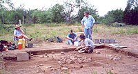 Before excavations began at the Graham-Applegate site in the summer of 1998, there was little evidence that the remains of a prehistoric encampment were buried only a few inches beneath the ground surface. A year earlier, the Llano Uplift Archeological Society had conducted a survey of the area at the request of the landowner, Charlotte Graham, and found only a few flint flakes. Since the soils at the site are shallow, it was felt at the time that if anything of archeological significance existed there, more artifacts or features would be visible on the surface. Reinforcing the idea that little would be found there was the fact that no permanent water flows in the immediate area today. The closest reliable source of water is the Llano River, a half-mile to the west over rough terrain. Early in 1998, the chance discovery by Ms. Graham of a half-dozen flint arrow points protruding from the backdirt piles of gopher holes provided the first real hints that something archeologically important might be buried there. All the arrow points were of the same type or "style" suggesting that only a single cultural group may have camped there. If so, it seemed the site could well be a time capsule containing information about life in central Texas at a particular period in the prehistoric past. In this case, the style of point was known to have been used between A.D. 700 and A.D. 1350, during what archeologists call the Austin Phase. Recognizing the site's potential importance, the Llano Uplift Archeological Society (LUAS) made the decision to undertake investigations at the site. Initially, the research plan was to excavate large areas where the arrow points were found and where it seemed the most intensive activity took place in prehistoric times. Our hope was that living surfaces would be exposed, perhaps even the remains of shelters or areas where specific activities, stone-tool making for example, took place. The shallow soils were ideal for a broad horizontal excavation (opening up large areas) since the hoped-for living surface could be reached quickly. At sites with deep archeological deposits, such as those on river terraces, excavated areas often are small due to the large volume of soil that must be removed. At the beginning of the investigations, we also hoped to recover a discrete (unmixed) assemblage of the kinds of stone tools used by people during the Austin phase. Few open campsites of this period have been investigated that do not also contain artifacts from earlier and later aboriginal cultures, mixed in with those of the Austin phase. A 4-x-6-meter (16.7-x-20-foot) area was initially excavated down to a depth of 25 centimeters (10 inches), revealing two small hearths to one side of an extensive refuse scatter of burned rock, mussel shells, and stone tools. Large numbers of flint flakes, along with cores and unfinished bifaces indicated that stone-tool making took place there. Three obsidian flakes also were found in this "lithic workshop" area. In the fall of 1998, LUAS obtained permission to do test excavations of the adjacent Applegate property that lies immediately to the north of where we were working. It was assumed at the time that the remains of the Austin phase occupation continued onto this property, although almost no artifacts were noticed in the gopher mounds that also dotted the surface of the Applegate land. Hidden Midden ExposedAt this point, we wanted to know not only how far the site extended to the north, but also the nature of the aboriginal occupation there: Would we still find the same kinds of artifacts and features? Would they date to the Austin phase or was this area occupied by earlier or later cultures? A series of 1-x-2-meter ( 3.3-x-6.7-foot) test pits was excavated at widely spaced intervals to the north and then to the east and west on the Applegate property in an attempt to answer these questions. These excavations showed that the Austin phase occupation continued at least 50 meters (167 feet) to the north with scattered hearths and stone tools although the amount of flint chipping debris decreased considerably. One of the test pits near the edge of a deeply cut arroyo that borders the west side of the site revealed what was at first thought to be an unusually large and elongated stone hearth. To better record this feature, adjacent units were excavated, and to our surprise, other stone features began to emerge. Only after an 2-x-5-meter (6.7-x-13.4-foot) area was opened up, however, did it become apparent that these rock features were related. Collectively they appeared to form the walls and central hearth of a large circular structure that was eventually designated "House 1." The finding of an apparent house was big newsit had been several decades since the last house remains had been found in central Texas. Archeologists from the Lower Colorado River Authority, TARL, and the Texas Historical Commission visited the site and offered opinions and encouragement. With the discovery and excavation of the first "house," our research plan was changed to actively seek out additional house-like features at the site. Since there were no clues on the surface to lead us to them, the only sure way of finding similar features was to cover as much of the site as possible with test units. This strategy initially failed to find additional "houses" but did lead to the discovery of a burned rock midden. Typically, burned rock middens are conspicuous features littered with fire-cracked rocks and often forming an obvious mound. But we only became aware of the one at Graham/Applegate through a randomly placed test pit which revealed an area of tightly packed, burned granite rocks with dark, charcoal-stained soil only inches below the surface. The midden had been all but invisible since it blended with the natural contours of the land and was hidden by dense brush and leaf litter near the edge of the arroyo only 15 m (50 ft) south of House 1. Over the next several months,