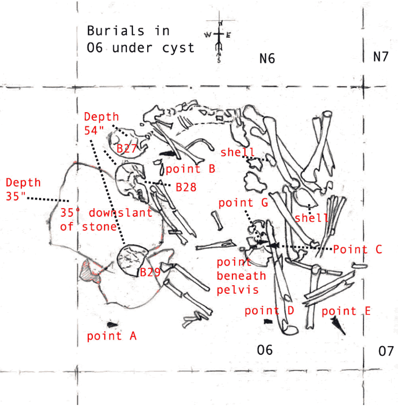 A 1938 field drawing of a multiple burial (27-29) records the close position of the individuals and the arrow points which likely killed them. Adapted from Fox, 1938; TARL Archives.