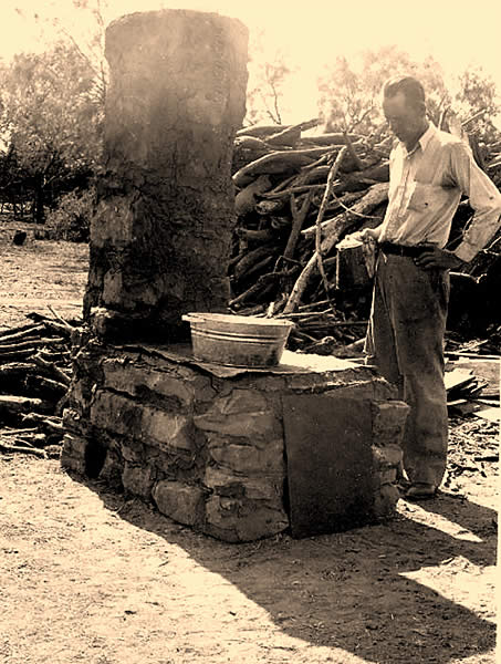 A WPA worker keeps a watchful eye on a pan heating over a twentieth-century "cooking hearth." Photo from TARL Archives.