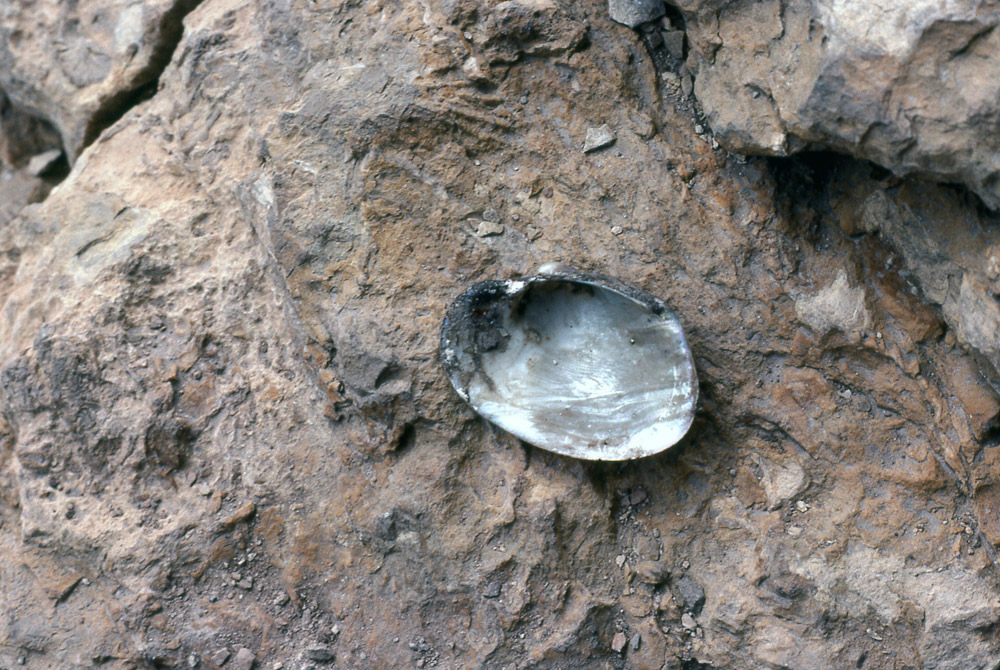 The large mussel shell was found cached in a wall niche at the rear of the cave. TAMU Anthropology archives.
