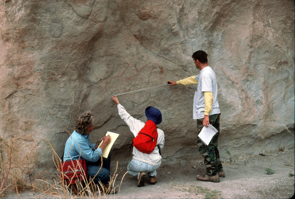 | TPWD Archeologist Ron Ralph and team members record a red pictograph of a horse during a months-long effort to identify locations and status of rock art in the park. At right is Mike Bilbo who was instrumental helping to record rock art. Photo courtesy Texas Parks and Wildlife Department. |