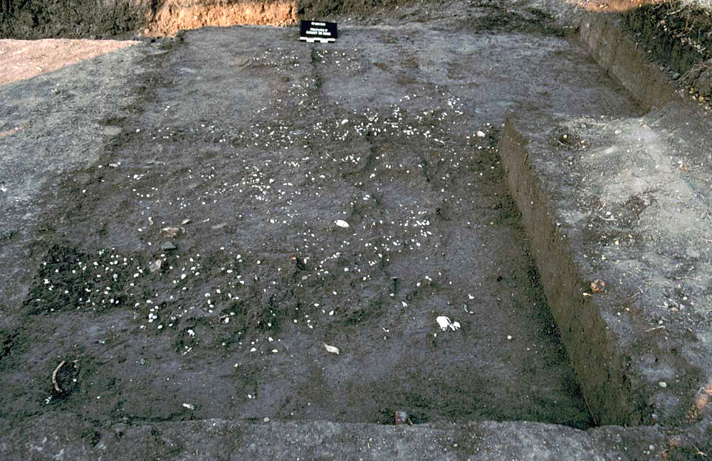 | Feature 17 was a concentration of land snail shells in the Main Block. It was composed almost completely of the land snail, Rabdotus dealbatus dealbatus, and contained almost 3,000 shells. Size measurements confirmed that the feature was composed of only adult snails. The lack of younger snails suggests that the larger adult snails were collected as food and that the concentration does not represent a natural land snail die off where snails of all ages would be represented. |