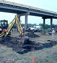 The planned replacement of a highway bridge spanning part of the wide, nearly flat Little River floodplain led to the archeological investigation of the J. B. White site and two other nearby prehistoric sites. This section explains how the archeological research unfolded in advance of bridge construction. All planned road construction activities by the Texas Department of Transportation (TxDOT) are evaluated for their potential to affect sites important to the history and prehistory of the United States. Staff archeologists from TxDOT's Archeological Studies Program of the Environmental Affairs Division do these initial evaluations. TxDOT examined the bridge replacement project area. They noted that the part of the project area within the river floodplain was cut by many sloughs and abandoned channels of the river. These kinds of natural features suggest a long history of intermittent flooding. During such floods, the river sometimes changes course and cuts a new channel leaving behind an abandoned channel that slowly fills with sediment from later floods. Floods can preserve archeological sites along these abandoned channels by quickly burying them. It was obvious that the Littler River floodplain needed to be probed along the planned bridge route to search for buried prehistoric sites that might be associated with these old channels. In 1999, TxDOT archeologists employed a backhoe to probe the nearly two-mile-long project corridor through the valley and look for sites buried by flood deposits. They oversaw the excavation of 28 backhoe trenches. Twelve of these trenches encountered artifacts and other evidence marking three prehistoric sites (see graphic at top of page). Site 41MM339 was found to be 11 feet or more below the modern surface on the edge of an old channel that was itself buried. Though this site appeared to be important, it was deep enough to escape damage from bridge construction, and thus no further investigation was needed. However, sites 41MM340 and 41MM341 (now known as the J. B. White site) yielded archeological evidence buried from 1 to 6 feet below the surface of the modern floodplain. Both sites were judged to have important research potential. They produced stone tools and considerable debris from making stone tools, as well as animal bones, mussel shells, and well-defined fireplaces built by Native Americans. Since these sites would be disturbed by the planned bridge construction, they were recommended for further study. Part of the both the initial evaluation and later investigation involved what is known as geoarcheological investigation, the application of geological techniques to address archeological problems. In this case, the archeologists needed to understand how the Little River floodplain had formed over time to determine where the river was when the sites were occupied and how they may have become buried. Specialists with strong geological training carefully studied and sampled the walls of each backhoe trench (and later excavation units). Gradually they unraveled the sequence of flood terrace formation and used radiocabon dating to determine when each period of soil formation and channel cutting had occured. These geoarcheological investigations determined that the archeological remains at the J. B. White site and other nearby sites occur within buried soils formed on a series of floodplain surfaces on which people had lived. These old soils in the vicinity of the sites were cut by several sloughs or old channels of the Little River. The river apparently had moved to near its present position by the time the J. B. White site was occupied. Test ExcavationsFollowing the initial evaluation, the next stage in the research process consisted of digging a series of small test pits by hand at 41MM340 and the J. B. White site, the two sites that would be affected by bridge construction. This testing phase was carried out in 2000 by a team from the Center for Archaeological Research (CAR) at the University of Texas at San Antonio working for TxDOT. Eventually, the CAR archeologists would go on to carry out major excavations at 41MM340, but that’s another story. Their testing of the J. B. White site involved reopening several of the previously dug backhoe trenches followed by the hand excavation of two small areas ("blocks") measuring 2-x-2 meters (about 6-x-6 feet) off of those trenches, as well as 121 auger tests across the site. Two trenches, both in the northern part of the site, had encountered hearths (firepits) and midden deposits (concentrations of prehistoric garbage). The two small testing blocks allowed the CAR archeologists to recognize and define three cultural zones and five hearth features. The three cultural zones reflected the sequence of occupations at the site. For instance, Zone 1 extending from the surface to 40 centimeters (1.3 feet) deep encompassed the remains of an apparent prehistoric garbage pit and a small concentration of chipped stone artifacts. Charcoal from that pit produced a radiocarbon date with a range of A.D. 1407–1440. In addition, 11 sherds from pottery vessels came 30 centimeters (1 foot) below the surface. These discoveries suggested that the archeological evidence in Zone 1 may have been left behind by the Toyah culture, people who lived in central Texas from A.D. 1300-1600 just before the arrival of the first Spanish explorers. The Toyah culture is the name archeologists have given to groups of people who lived mainly west of the J. B. White site on the Edwards Plateau during the Late Prehistoric period. But Toyah peoples sometimes ranged into the coastal prairies and often occupied sites eastward beyond the edge of the plateau and out onto the Blackland Prairie. They were buffalo and deer hunters, but they also took a wide range of other game and collected many plant foods. However, as the investigation of the J. B. White site progressed, it was determined that the occupational remains in Zone 1 were so sparse tha