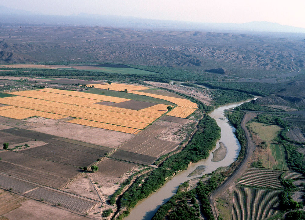 | Aerial view of the Rio Grande looking north just above (upstream) from the Polvo site. Modern irrigation allows the mechanized cultivation of the wide floodplain on the left in Mexico as well as narrower terraces on the U.S. side of the river. Prior to modern times, farming would have been restricted to much smaller, low-lying areas adjacent to the river where natural irrigation was possible. 1983 photo by Bob Parvin, courtesy Texas Historical Commission. |