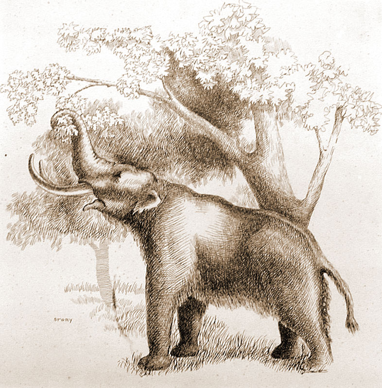 Wooly mammoths, such as the one shown here, would browse the lower limbs of their favored tree species causing them to have a trimmed-up look, much as modern elephants do today. Drawing by Hal Story, courtesy Texas Memorial Museum.