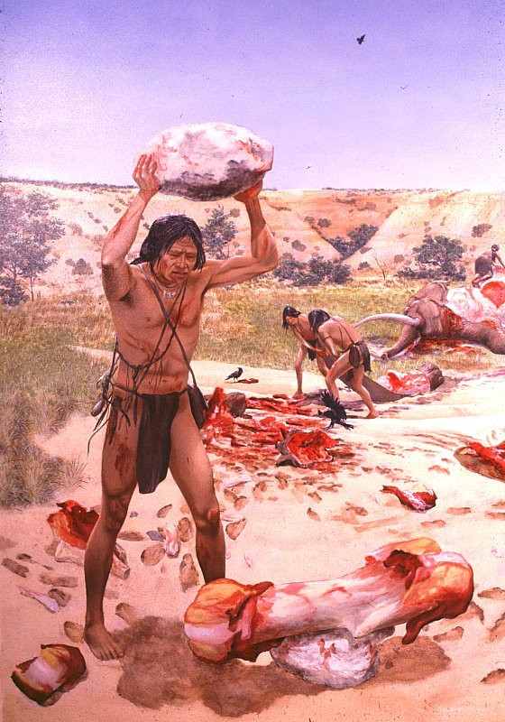 | Butchering a Mastodon, 1. A man hoists a boulder over his head to crack open the femur (thigh bone) of a mastodon (Ice-Age elephant) to get to the rich marrow inside the hollow leg bone. Behind him several men drag a severed lower leg to one side. Painting by Nola Davis, courtesy Texas Parks and Wildlife Department. |