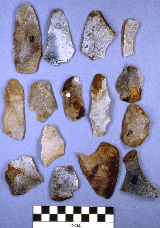 | Stone tools from Feature 86, the burial of a 35-45-year-old man who was also accompanied by two engraved whooping crane whistles, an olivella bead necklace, and a polished mussel shell. The chert artifacts shown here were found in a tight cluster on the man's lower abdomen near and around his right hand. In the top row, from left to right: a thin bifacial knife, two trimmed blades, and a prismatic blade. The other specimens are all blades and blade-like flakes that all have evidence of edge modification or use wear. Compared to most lithic artifacts found at Mitchell Ridge, or for that matter at any site on Galveston Island, these tools are quite large in size and very early in their potential use life cycles. Photo by Bob Ricklis. |