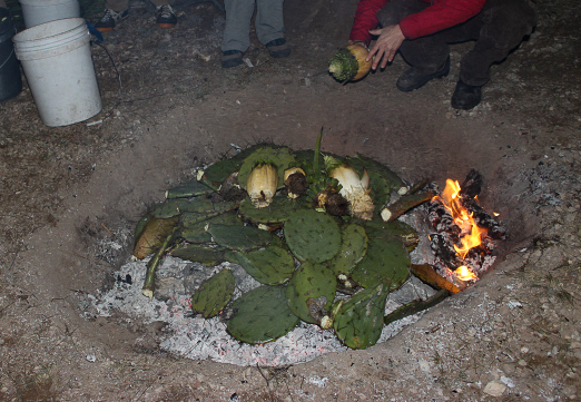 Earth oven plant baking is a method of cooking with hot rocks. It entails burying heated rocks and food items together in layered arrangements and letting the foods slowly cook under an earthen cap. In the Lower Pecos, earth ovens were primarily used for baking desert succulents. These hardy and fibrous plants require long cooking times and moist heat to remove toxins and convert long-chain carbohydrates into edible sugars.