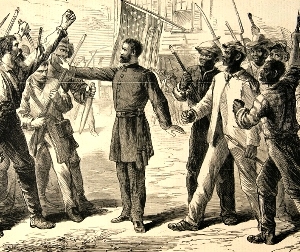 In this 1868 Harper's Weekly illustration, an officer representing the Freedman's Bureau holds off armed groups of white and black Americans. The bureau, charged with assisting freed slaves, enraged Southern whites who saw it as an extension of the army of occupation which envisioned a role for blacks they did not share. Wood carving by Alfred R. Waud, Library of Congress.  |