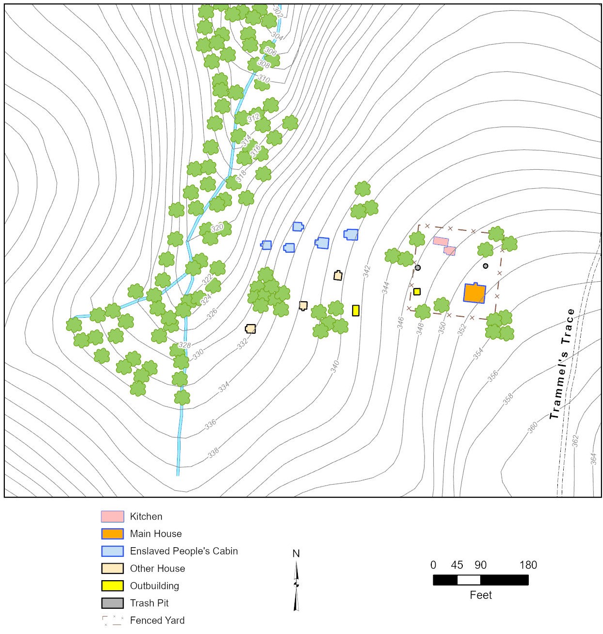 An exceptional attribute of the Hendrick plantation archeology is that archeologists know the locations and uses of the many buildings that made up the residential core. These included the "big house" where the Hendricks lived, the detached kitchen to the northwest where the enslaved cook prepared meals for the Hendricks and perhaps sometimes for other enslaved people, five cabins downslope to the west where the enslaved lived and where freedmen may have stayed after Emancipation, and three cabins nearby where archeologists think non-enslaved people lived. This latter group probably varied over time, but researchers know that Seaborn Hendrick Sr.’s widowed mother lived at the plantation, reportedly in her own house, from 1854 to 1869. Additionally, the 1860 census lists a 65-year-old farmer and 22-year-old schoolteacher as living on the plantation.
