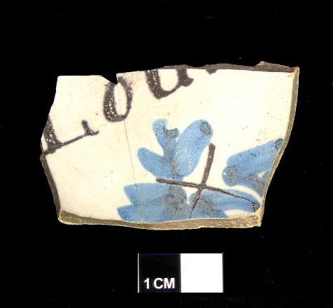 The few sherds of decorated French faience represent tableware and possibly a barber’s dish used at Fort St. Louis. The colorful blue and gold polychrome fragments shown at left are faience ware, typical of the Nevers region of France. Ceramic analyst Maureen Brown has suggested that several of the sherds may be from a barber or surgeon’s dish used in bloodletting, a common procedure thought to promote health. Such dishes were shaped with a raised rim and opening through which blood from a cut on the patient could be channeled and captured. The polychrome sherd at right bears the letters "LOU," and the decoration appears to be French. The remainder of the faience sherds from Fort St. Louis are undecorated (faience blanche; (see example of apothecary jar). Faience is a tin-enameled earthenware that was popular in France in the 17th and 18th centuries. TARL Collections. |
