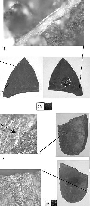 Among the variety of projectile points, several show evidence of hafting in the form of plant fibers involved in binding the point to the shaft, which included resin used as glue, and abraded ridges from movement against the haft. The use-material for the projectile points is generally not known. This is consistent with their use as projectile points, where contact with the use-material is usually too brief to create detctable wear and/or scratches.