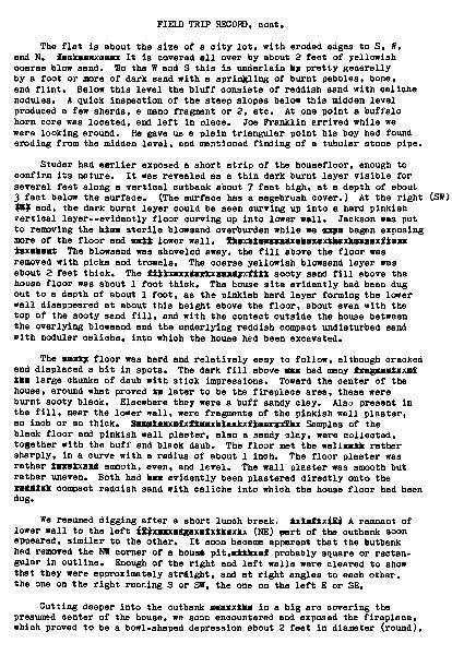 | Page from Hughes notes on a field trip with Floyd Studer on May 23, 1960 to northeastern Gray County. One of Studer's many rancher friends had taken him to a site along Cantonment Creek where a burned pithouse was eroding out of a cutbank. On this day, Hughes and Studer partly uncovered and documented what proved to be a Plains Village house. This was one of many sites in the eastern Panhandle that Hughes investigated. Photo by Rolla Shaller. |