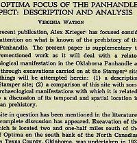 On the basis of these differences, Watson followed Krieger’s lead and defined the Optima focus, which she proposed to be the second grouping within the Panhandle aspect. The Optima focus, she argued, represented a Plains Village culture that was intermediate, geographically and chronologically, between the Upper Republican culture of the Central Plains and Antelope Creek. Although Watson’s Optima concept was used by Oklahoma archeologists for several decades, it never really caught on elsewhere. Subsequent work at other Plains Village sites in western Oklahoma has complicated the picture and called into question many of the inferences upon which the Optima focus was based. The recent (2002-2004) reanalysis of the Stamper site by Chris Lintz has pointed out some of Watson’s misinterpretations due to the incomplete information she had to work with.