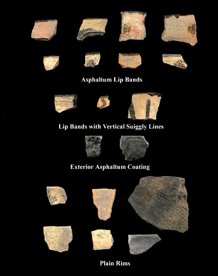By 1250 A.D. pottery technology had reached in the central coast. Sandy paste wares similar to Goose Creek Plain of the upper coast have been found at 41JK8 on the lower Lavaca River in association with Scallorn arrow points. The people of the central coast, probably ancestral to the historic Karankawa tribes, were making a distinctive pottery by A.D. 1250-1300. This pottery, known as Rockport Ware, is a distinctive trait of the Rockport Phase, which has been linked with the Karankawa. It is a thin, sandy paste pottery that is sometimes undecorated (Rockport Plain), sometimes decorated with incised markings (Rockport Incised) almost certainly inspired by upper coast styles, but most frequently coated and/or decorated with asphaltum. Decorations consist of narrow bands of asphaltum painted along the rims of pots. In some cases, vertically oriented sets of parallel squiggly lines are added, and these descend along the outside of jars and ollas (narrow-mouth vessels). Interiors of these pots were often coated with asphaltum, perhaps as a sealant, and exteriors were sometimes partially or completely coated, as well.