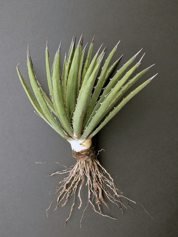 Lechuguilla plant with a few outer leaves removed to show the white inner leaf base, the leaf part that is edible. The plant is well armed by spines at the tips of the leaves as well as along the sides, earning the nickname “shinbuster.” Photo by Phil Dering.