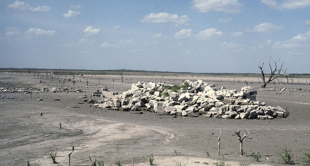 An early Spanish Colonial house, reduced to rubble while inundated, now lies exposed as water levels drop. In addition to residential structures, old cemeteries and churches are particularly vulnerable to looters.