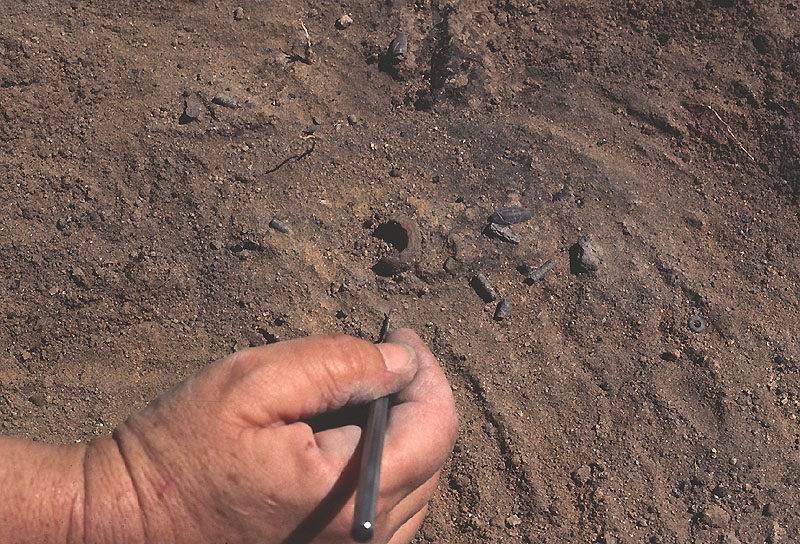 | Burned bone ring and shell beads being exposed. These were found within an irregular, trash-filled pit between pithouse rooms 13 and 17. This deposit in the outside area is not associated with any structure and perhaps represents some sort of ritual offering. |