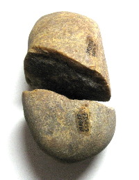 Conjoined pieces of quartzite cobble, the top half of which was found in Stratum 7, the bottom in Stratum 5E. Photo by Susan Dial.  |