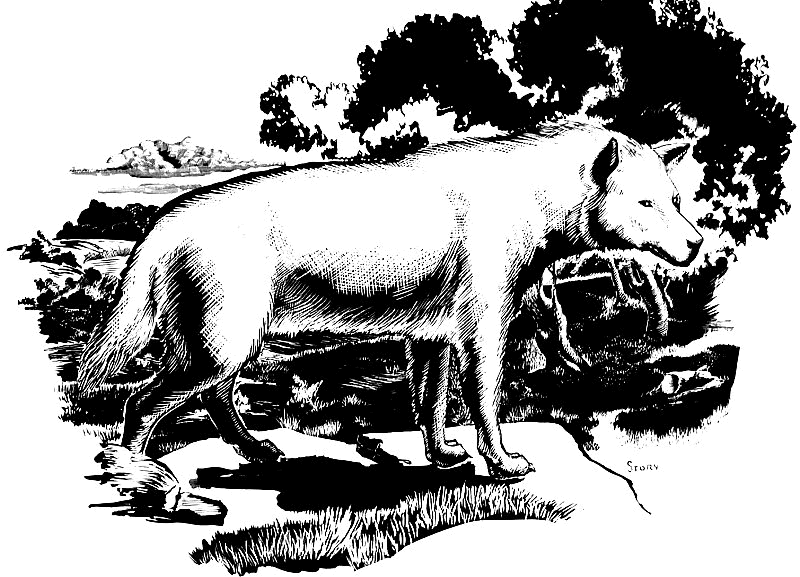 The dire wolf. Bones of this Late Pleistocene carnivore were found in Zone 3. Drawing by Hal Story.