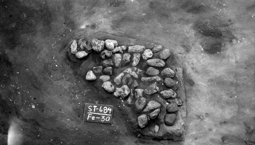 | This cluster of river-rounded rocks (Feature 30) may represent baking stones arranged as a hot-rock bed and capped by an earth oven. In fact, most of the "hearths" recognized at Morhiss probably represent the same type of cooking, pattern that has been documented in many areas of North America. TARL Archives. |