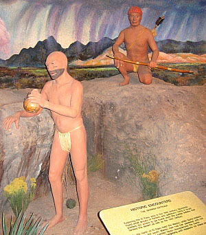 Artist's depiction of native people of the Rio Grande. The Sumas, characterized by tattooed or painted faces, and the Mansos, known for their distinctive red-plastered hair, were groups that early Spanish explorers encountered in the El Paso area. The Mansos were so named because their first words to the Oñate expedition were "manxo, manxo, micos, micos," which meant "peaceful ones" and "friends." Photograph of display, El Paso Museum of Archeology, by Susan Dial.  |