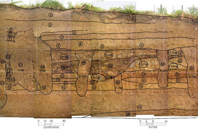 This photograph, a little farther from the center of the mound, shows many of the same things as the photograph to the left. Zone 16 is the natural ground below the mound. Zone 9 is a burned surface in the middle of the mound, and Zones 48, 49, 58, and 51 (also called F-192, F-193, F-201, and F-195) probably held posts for one or more buildings put on top of the Zone 9 surface. The remains of the earlier burned and collapsed building (Zone 12) are thicker here and partly rest on the two burned floors (Zones 13 and 14). On the right side, though, the building fell onto a low ridge of yellow and white earth that probably encircled the whole building. Zone 50 (F-194) below Zone 12 may be a posthole that went with the Zone 12 building, or maybe with another building on top of the layer of reddish dirt called Zone 27. It is hard tell which, though, because the Caddo removed most of Zone 27 when they excavated a shallow depression to hold the building that Zones 12, 13, and 14 represent. This photograph does not show any burned surfaces in the upper part of the mound. This is partly because the top of the mound is sloping down and getting thinner, so it has been more affected by erosion. Disturbance from animal burrowing may be another factor. The archeologists decided that, because of its irregular shape, Zone 47 (F-191) might be where an animal dug into the mound and churned up the dirt after the Caddo left the site. |