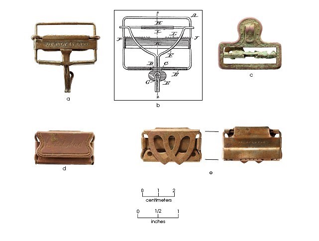 In the nineteenth century, trousers were commonly held up with suspenders rather than a belt running through belt loops. A pair of suspenders consisted of leather or fabric straps that were placed over one's shoulders and attached to the front and back of the pants using buttons or clamps. Suspenders typically had a pair of buckles on the chest side of the strap so the strap length could be adjusted for a perfect fit. Suspenders were very common in the nineteenth century, and continued in popularity well into the twentieth century. Artifacts from the farmstead indicate that the Williams' men and boys owned and used a variety of different suspenders. One specimen is a nickel-plated buckle (a) with an 1890 patent date stamped into one of the pieces. This buckle matches the sketches of a "Suspender Buckle" (b) patented in 1890 (Patent No. 432,258, issued to S. Baum and V. B. Ulman, Google Patents). Another suspender buckle (c) has an ornate geometric design and a different type of locking mechanism. A suspender adjuster (d) has the name "Carlsbad" stamped into its face. This mark may be a trade name used by a specific manufacturer, but it has not been identified. A nickel-plated suspender adjuster (e) is stamped with "PAT APLD FOR," indicating that a patent application was made for the design, but there were hundreds of different patents issued for suspenders and suspender parts and this particular patent has not been found.